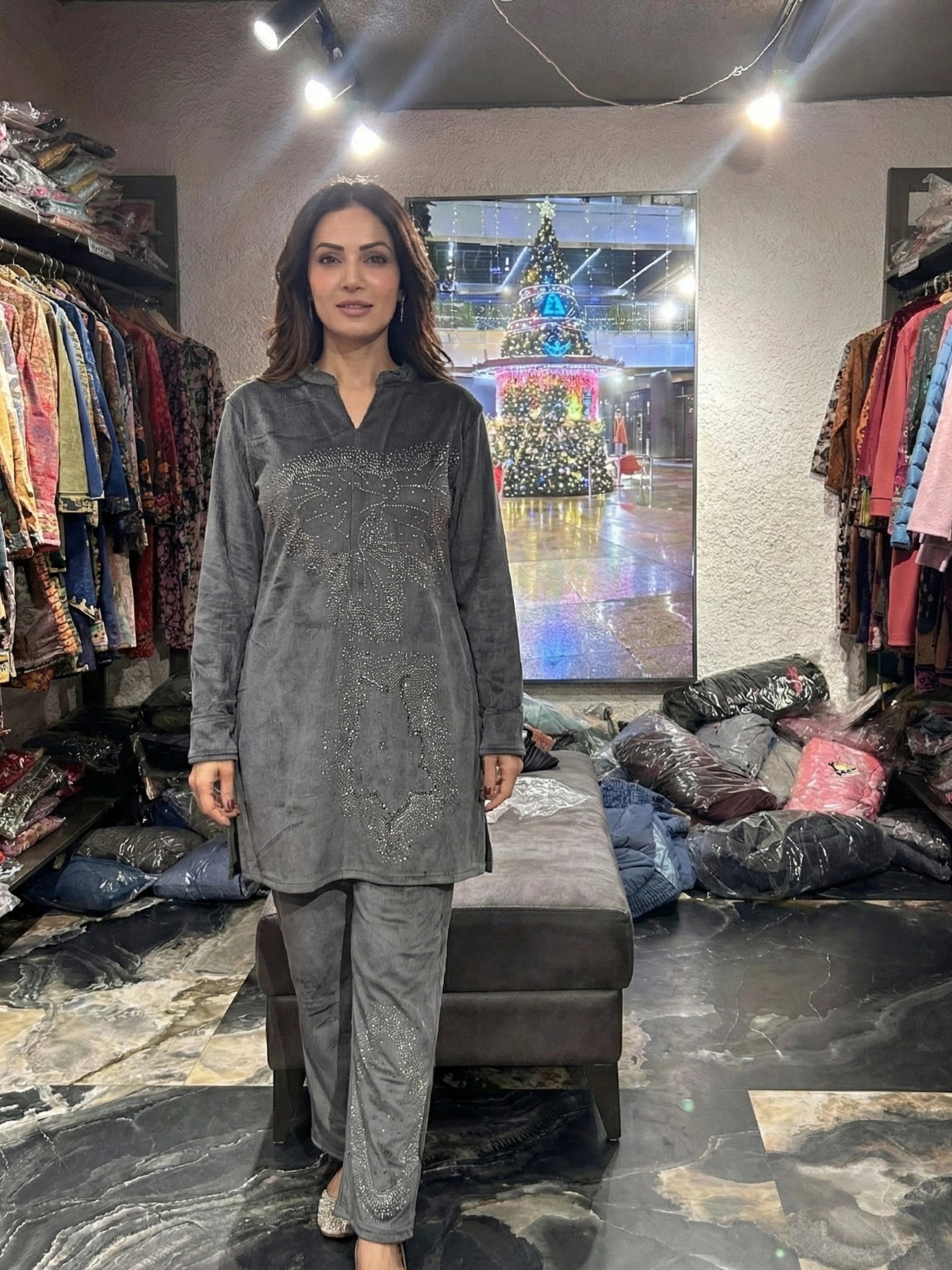 Elevate your winter wardrobe with this luxurious two-piece set that combines comfort with glamour. Designed with a subtle ribbed texture, this ensemble features dazzling crystal work on the bodice and ankles, making it perfect for evening gatherings or chic casual wear.