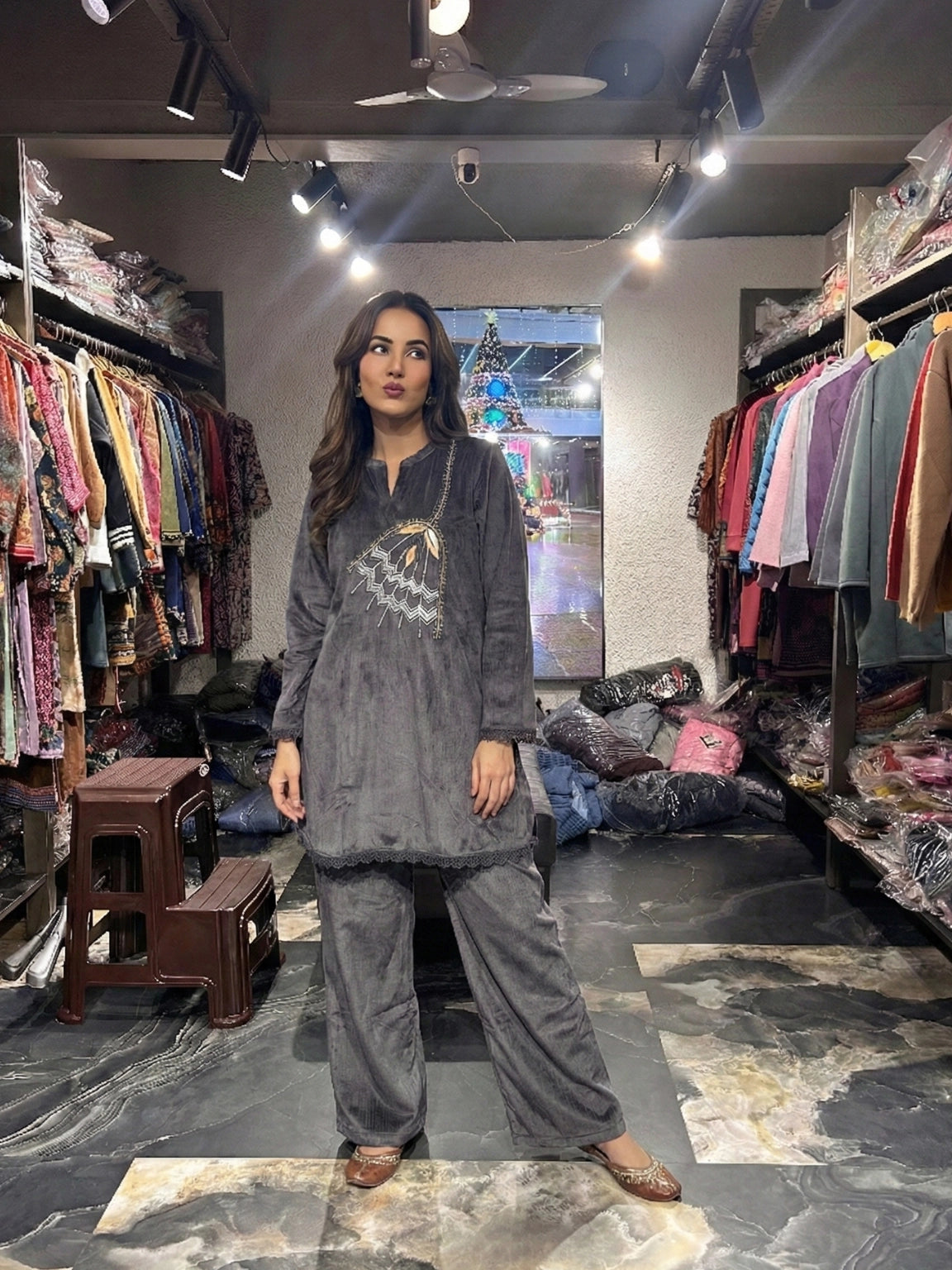 Elevate your winter style with this luxurious two-piece ensemble. Designed for both warmth and elegance, this set features a relaxed tunic paired with matching comfortable trousers, perfect for the colder months.