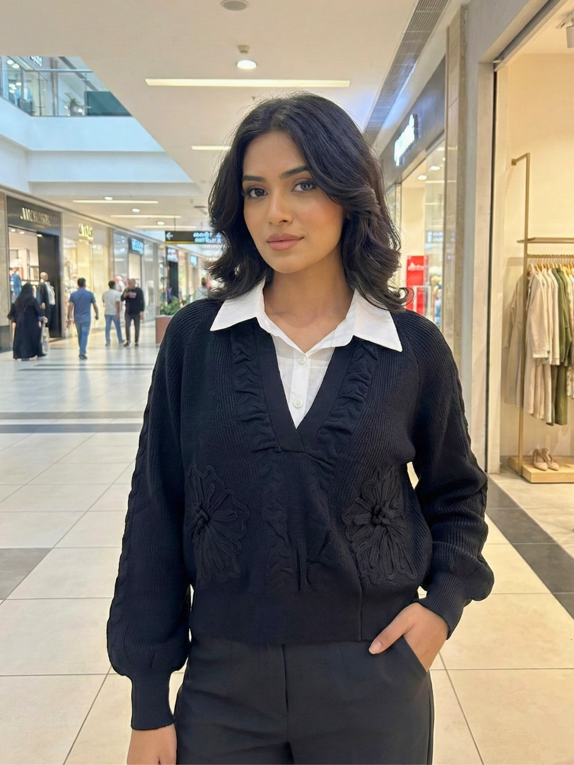 Design: Deep V-neckline with intricate 3D floral texture and cable knit details.