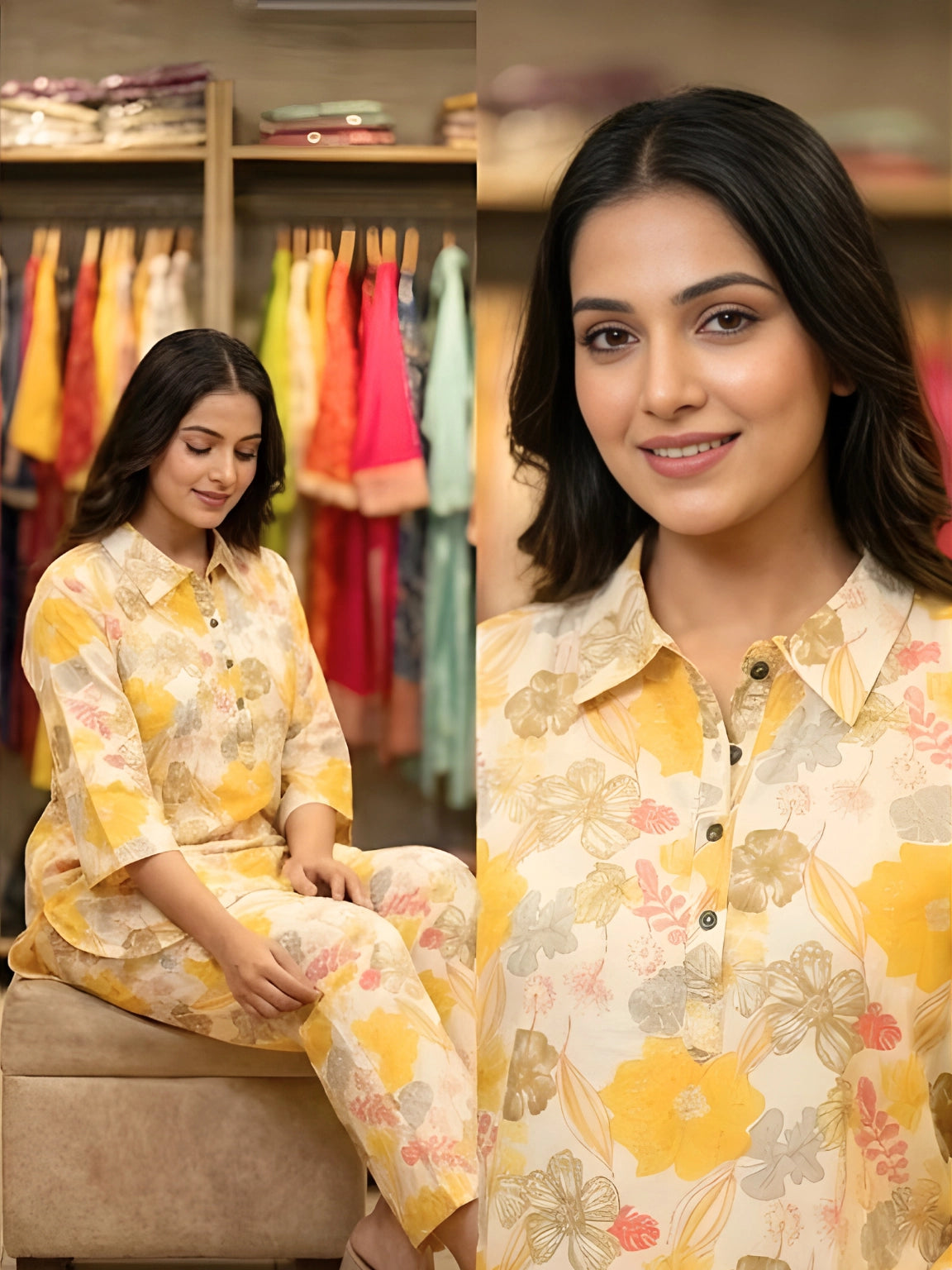 Yellow and Cream Floral Print Button-Down Co-Ord Set